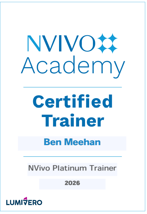 projects (CAQDAS). A graduate of the Irish Management Institute and Dublin Business School, he is also a member of the part-time staff in Trinity College Dublin, NUI Galway, NUI Maynooth and Dublin City University. He is a Lumivero certified platinum trainer and consultant. He has worked in all the major universities and Institutes of Technology in Ireland and Northern Ireland. His work outside the educational sector includes major global companies such as Intel where he consults in support of their ongoing ethnographic research and the Centre for Global Health where he has worked in Tanzania, Malawi, and Mozambique and in Ghana, Burkina Faso and Tanzania with the University of Heidelberg and Ethiopia for the Ethiopian Public Health Association and the Population Council, Zambia. Apart from Africa, Ben regularly conducts workshops in Germany, France, UK, Northern Ireland, Holland, the US, and Australia. Ben is 63 years of age, married with two children and lives in Dublin, Ireland. He is passionately interested in technology and its utilisation in everyday life to enable people to do things more easily, more efficiently and better generally.